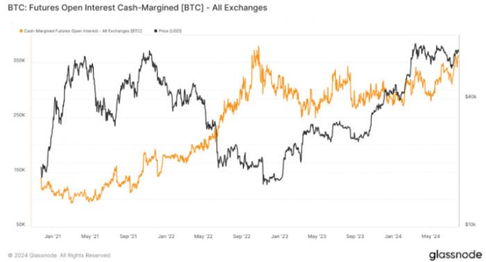 隨著2024年的推進,Bitcoin市場的波動性和交易量持續引起投資者的關注。最新的鏈上數據顯示,Bitcoin期貨的未平倉合約數量(Open Interest, OI)與Bitcoin現貨價格呈現出高度相關的走勢。