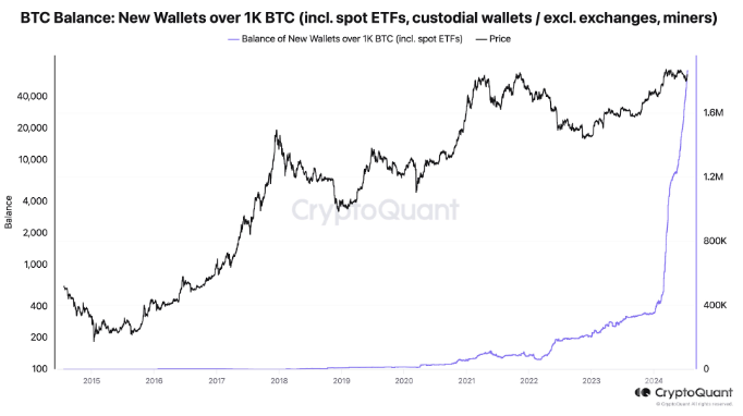 CryptoQuant首席執(zhí)行官Ki Young Ju指出,擁有至少1000 BTC的Bitcoin地址每周平均增加超過100,000 BTC。他提到:“鯨魚錢包(>1K BTC),包括現(xiàn)貨 ETF 和托管錢包,今年新增145萬BTC,總計180萬BTC。2021年,全年轉(zhuǎn)移約7萬枚BTC;現(xiàn)在,這個數(shù)字是每周10萬Bitcoin。我重復(fù)一遍,每周10萬Bitcoin。”