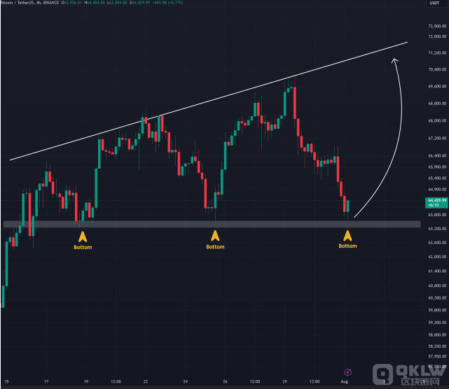 crypto分析師Elja在8月1日于X平臺上表示,Bitcoin價格可能在63,000美元上方形成新的局部底部,該水平此前是BTC在四小時圖表上的強勁支撐:“BTC已經(jīng)觸底。現(xiàn)在是綠色大蠟燭出現(xiàn)的時候了。”