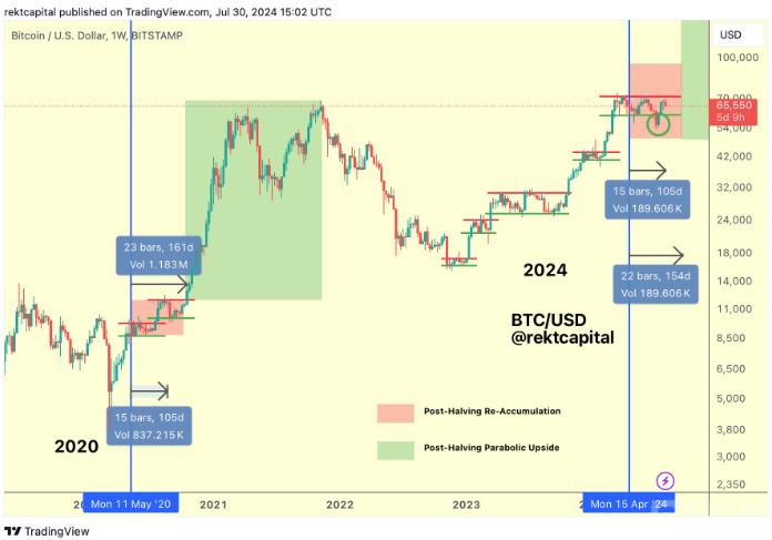 Bitcoin在70,000美元的心理阻力位遭到拒絕,著名分析師Rekt Capital認(rèn)為,Bitcoin可能會在該區(qū)間保持一段時間。他在7月30日的X平臺上寫道:“Bitcoin仍有望突破。歷史表明,減半后約100天突破重新積累區(qū)間總是不太可能的。”