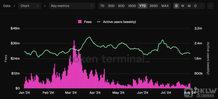 鏈上數據顯示,2024年第一季度,Ethereum日均產生的費用超過1000萬美元;2024年3月,這一數字達到了1500萬美元。到第二季度,平均每日費用降至約350萬美元,7月份的平均總收入略低于300萬美元。
