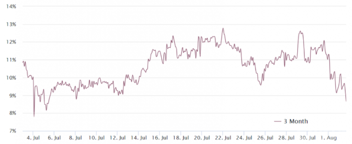 在7月23日現貨ETF推出之前,Ethereum月度期貨曾表現出溫和的樂觀情緒,溢價達到12%。現貨ETF的凈流出和更廣泛的crypto市場調整導致該指數在8月2日下跌至8%。考慮到價格在24小時內下跌10%,這一水平雖屬中性,但并不罕見。