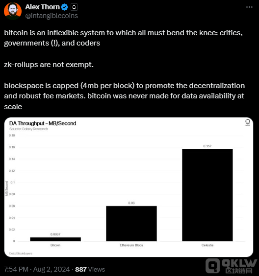 Galaxy Research 的分析師 Gabe Parker 在報(bào)告中指出,Bitcoin Rollups 面臨的一個(gè)主要障礙是數(shù)據(jù)發(fā)布成本。Rollups 需要定期將大量交易數(shù)據(jù)發(fā)布到BitcoinBlockchain,以確保網(wǎng)絡(luò)的安全性和Decentralization。BitcoinBlockchain的容量有限,每個(gè)區(qū)塊只有4MB的存儲(chǔ)空間,這使得數(shù)據(jù)發(fā)布變得昂貴且復(fù)雜。