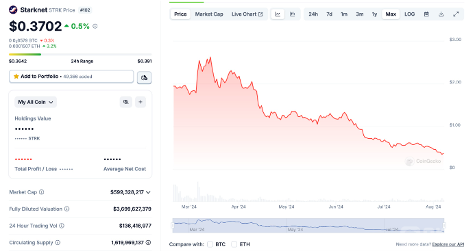 盡管 Starknet 在領(lǐng)導(dǎo)層變動中繼續(xù)前行,其原生Tokens STRK 卻面臨嚴(yán)峻挑戰(zhàn)。自 2024 年 2 月推出并曾達(dá)到 4.42 美元的峰值以來,STRK 的價格已暴跌 91%,目前交易價格約為 0.37 美元。這一價格下跌反映了市場對 Starknet 生態(tài)系統(tǒng)的擔(dān)憂。