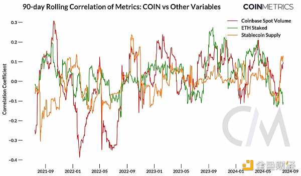 COIN收益與關(guān)鍵指標(biāo)之間的90天滾動(dòng)相關(guān)性顯示出顯著的變化,反映了Crypto市場(chǎng)和與Coinbase業(yè)務(wù)相關(guān)的指標(biāo)的動(dòng)態(tài)性質(zhì)。在Coinbase作為一家上市公司的早期階段,COIN收益與交易所的現(xiàn)貨交易量呈現(xiàn)出最高的正相關(guān)和負(fù)相關(guān)(+0.3至-0.4),表明其對(duì)投資者的最初重要性。然而,隨著時(shí)間的推移,它與穩(wěn)定幣供應(yīng)和ETH質(zhì)押量變化的關(guān)系也變得越來(lái)越突出,盡管這種關(guān)系仍然很弱,這表明投資者的注意力正在逐漸轉(zhuǎn)向新的收入來(lái)源。$COIN與市場(chǎng)回報(bào)之間的相關(guān)性