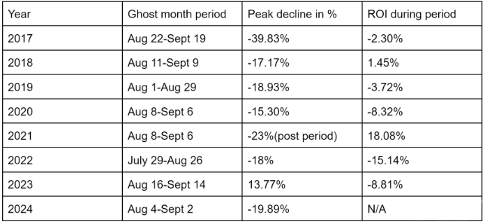 自2017年以來,每當“鬼月”來臨時,Bitcoin價格通常會出現顯著下跌。盡管每年的投資回報率并不總是悲觀,但該時期的波動性卻往往加劇。