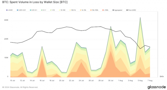 近期Bitcoin市場經歷了劇烈的價格波動,導致虧損交易量達到自FTX崩潰以來的最高水平。根據最新數據顯示,從8月3日至5日,Bitcoin價格從60,000美元急劇下跌至54,000美元,這一波動引發(fā)了大規(guī)模的虧損交易。8月3日的總虧損交易量超過74,890BTC,而到8月5日,這一數字飆升至319,290BTC,創(chuàng)下了自2022年11月28日以來的最高水平。
