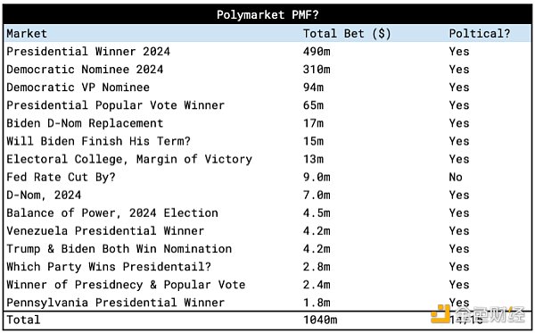 在看到這些數(shù)據(jù)后,Polymarket是否實(shí)現(xiàn)了PMF的問題變得越來越重要。數(shù)據(jù)表明,絕大多數(shù)Polymarket的使用都集中在政治市場(chǎng)和美國大選上——這使Polymarket成為了“閃亮的新玩具”。