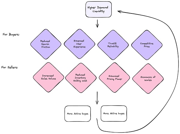 2.需求的復(fù)合增長(zhǎng)效應(yīng)(CompoundNatureofDemand):在一個(gè)成功的Marketplace平臺(tái)上,需求的增加應(yīng)能夠引發(fā)進(jìn)一步的需求增長(zhǎng),從而形成一個(gè)自我強(qiáng)化的飛輪。當(dāng)平臺(tái)上的需求增長(zhǎng)時(shí),隨之而來的交易活動(dòng)要能夠迅速激發(fā)供應(yīng)的增長(zhǎng)響應(yīng),這種響應(yīng)不僅能提高產(chǎn)品的多樣性和質(zhì)量,還能提升用戶體驗(yàn),乃至對(duì)平臺(tái)的信任以達(dá)成品牌效應(yīng)嗎,進(jìn)一步驅(qū)動(dòng)網(wǎng)絡(luò)效應(yīng),使得平臺(tái)的整體價(jià)值持續(xù)提升。只有高效地實(shí)現(xiàn)這種飛輪效應(yīng),Marketplace平臺(tái)才能通過持續(xù)改進(jìn)和創(chuàng)新,不斷適應(yīng)和滿足用戶的需求,從而保持長(zhǎng)期的競(jìng)爭(zhēng)優(yōu)勢(shì)。