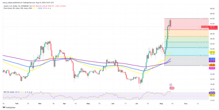 Wilcox在8月10日的博客中提到,Zcash需要從工作量證明(PoW)機制切換到PoS,以提高其隱私和安全性。盡管當前價格接近44美元的強阻力位,ZEC的RSI值已高于70,顯示出超買狀態,可能面臨回調風險。