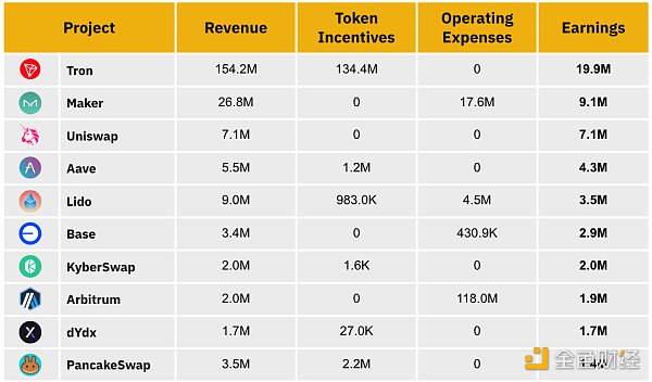 依據(jù)最近30天的數(shù)據(jù),盈利能力領(lǐng)先的協(xié)議(在TokenTerminal的樣本數(shù)據(jù)集內(nèi))是Tron、Maker和Uniswap。