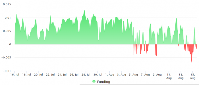 自8月8日以來,BTC一直在窄幅區間內波動,無法突破62,000美元,同時鞏固58,000美元的支撐位。大盤的整體波動反映出交易員收到的信號日益不確定,尤其是在BTC期貨融資利率仍為負的情況下,這表明買家的杠桿需求較低。問題在于,是否可以僅憑這一指標來決定crypto市場的走勢,或歷史模式是否預示著即將出現反彈。