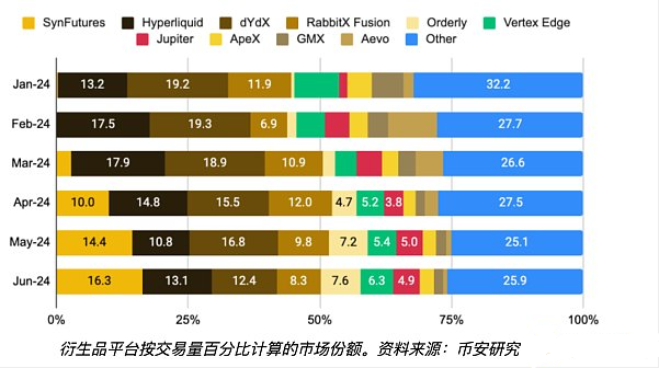 市場(chǎng)競(jìng)爭(zhēng)的加劇也推動(dòng)了鏈上衍生品的發(fā)展。雖然dYdX在2024年上半年仍然是市場(chǎng)的領(lǐng)導(dǎo)者,但面臨著來(lái)自SynFutures、Hyperliquid和RabbitX等新興協(xié)議的激烈競(jìng)爭(zhēng)。這些新興平臺(tái)通過(guò)專注于產(chǎn)品開(kāi)發(fā)和用戶獲取,繞過(guò)了復(fù)雜的Tokens結(jié)構(gòu),實(shí)現(xiàn)了顯著的增長(zhǎng)。