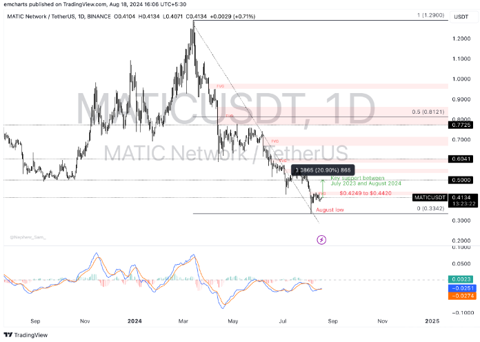 在MATICTokens遷移的背景下,市場對(duì)其價(jià)格走勢充滿期待。經(jīng)過一段時(shí)間的看跌行情后,MATIC在2024年7月成功脫離了低迷期。目前,MATIC的交易價(jià)格約為0.41美元。分析師預(yù)測,價(jià)格有望上漲20.9%,達(dá)到0.50美元。這一價(jià)格水平將成為MATIC的關(guān)鍵支撐位。
