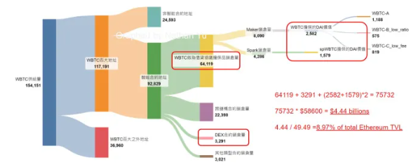值得關注的是,WBTC 作為 MakerDAO 和 Spark 等借貸協(xié)議中的擔保品,會創(chuàng)造出新的 DAI 供給量。這些新增的 DAI 通常會被投入其他協(xié)議中,以賺取更高的收益率。根據計算,WBTC 對Ethereum DeFi 生態(tài)的 TVL 貢獻目前約為 44.4 億美元,占總 TVL 的 9%。以 BTC 計價,總金額約為 90 億美元。