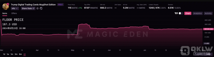 2022年12月,特朗普推出了他的第一個NFT系列“Trump Digital Trading Cards”,該系列售價每張99美元,在不到一天內便售罄。2023年,特朗普繼續推出兩個新系列NFT“Trump Digital Trading Cards Series 2”以及“Mugshot Edition”,并推出了包括特朗普晚宴、簽名紀念品等NFT權益。