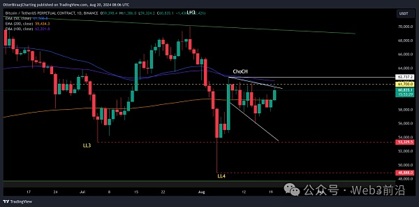 如果Bitcoin能夠突破EMA提供的集體阻力和61,700美元,那么當(dāng)BTC突破62,737美元上方時(shí),看漲反轉(zhuǎn)將得到確認(rèn)。九月,這可能會導(dǎo)致一個名為“ChoCH”或“性格改變”的市場信號——趨勢逆轉(zhuǎn)的跡象。