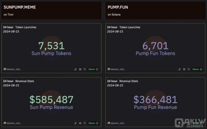 據Blockchain研究員Adam的最新數據,Sun Pump在過去24小時內的協議收入超過了Pump.fun。Adam引用Dune Analytics的數據指出,Sun Pump在過去24小時內發行了7351個Tokens,創造了58.5萬美元的收入。而同期,Pump.fun僅創建了6701個新Tokens,收入為36.6萬美元。這一數據表明,Sun Pump在Tokens發射和收入方面的表現超過了Pump.fun,顯示出其強勁的市場競爭力。