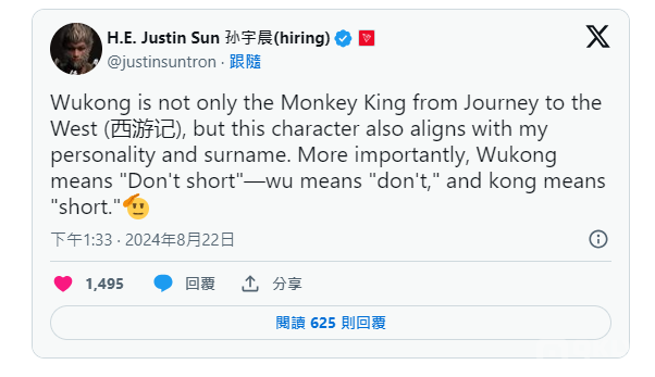 孫宇晨在推特上的一則推文中,借用《黑神話:悟空》中的角色悟空進行了一番諧音梗的玩笑。他解釋了“悟空”不僅是西游記中的孫悟空角色,也符合他的個性和姓氏。更重要的是,悟空的意思是“不要空”,其中“wu”的意思是“不要”,“kong”的意思是“空”。這種幽默的回應不僅緩解了投資者的焦慮,也展示了孫宇晨的幽默和智慧。
