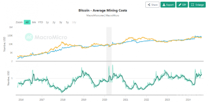 自四月份Bitcoin減半以來(lái),礦工的運(yùn)營(yíng)成本大幅增加,而Mining獎(jiǎng)勵(lì)減少,導(dǎo)致許多礦工面臨虧損。根據(jù)MacroMicro和 CoinMarketCap 的數(shù)據(jù),挖掘一枚Bitcoin的平均成本為72,224美元,而當(dāng)前Bitcoin價(jià)格為60,797美元。