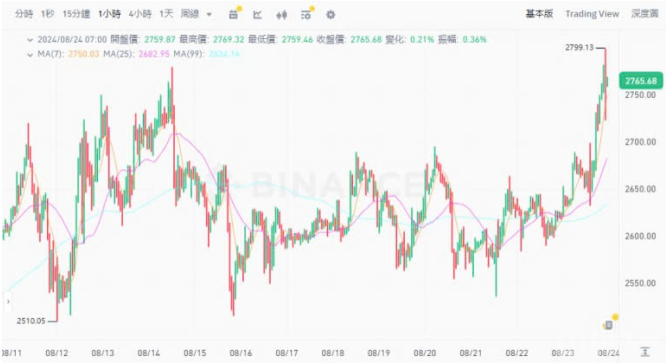盡管Ethereum現貨ETF的表現相對疲軟,連續六天出現凈流出,主要受灰度ETHE持續流出資金的影響,但ETH在本周成功打底,并于昨日突破2,700美元,現報2,765美元。這一突破為Ethereum的后續表現帶來了積極信號。