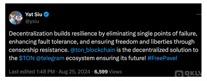 Animoca Brands 共同創辦人 Yat Siu 也在社交平臺 X 上表達了對 TON 網絡和 TG 的支持。他強調Decentralization是抵抗審查、維護自由的關鍵,并在推文中標注了「#FreePavel」以示支持。