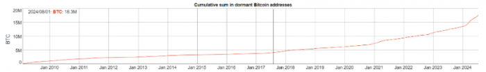 這一現象引發了市場的熱烈猜測,特別是在多個休眠錢包被重新激活、數百萬美元的Bitcoin被轉移的背景下。根據BitInfoCharts的數據,不活躍錢包中的Bitcoin數量自2024年1月的740萬枚增加到現在的1830萬枚。