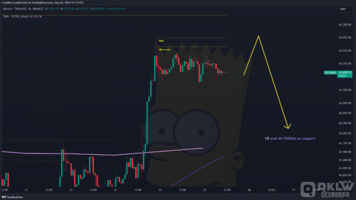 著名分析師 CrypNuevo 提出,Bitcoin可能會形成經典的“巴特辛普森”模式,預計在 1 小時和 4 小時的時間框架內回落至 50 周期均線。他表示:“關鍵支撐位在 63,500 美元和 62,200 美元附近,這可能會導致價格進一步回調。”