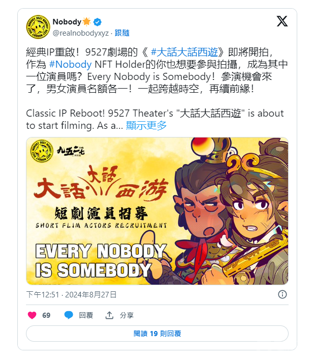 值得注意的是,這次《大話大話西游》的演員招募有一個特殊的條件:報名者必須是“周星馳先前發(fā)行的Nobody NFT”的持有者。這一條件雖然限制了報名者的范圍,但也為持有者提供了一個獨特的機(jī)會。