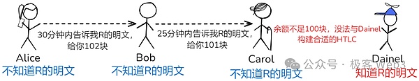 Carol如法炮制,在和Daniel的通道中創(chuàng)建HTLC:Carol愿意支付100塊,但Daniel要在20分鐘內(nèi)告訴她R的明文,否則錢(qián)會(huì)被Carol收回。