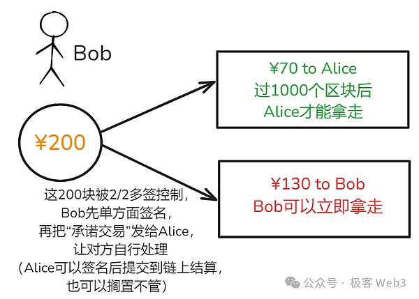 這里我們要注意:這筆承諾交易是Bob主動(dòng)構(gòu)造的,其中條件對(duì)Alice不利,Alice只能接受/拒絕,我們要想辦法留給Alice一些自主權(quán)。在支付通道的設(shè)計(jì)中,只有Alice自己能把“對(duì)自己不利”的承諾交易放到鏈上觸發(fā),這是因?yàn)槌兄Z交易要湊足2/2多簽,Bob在本地構(gòu)造交易后只有自己的簽名,沒(méi)有Alice簽名。