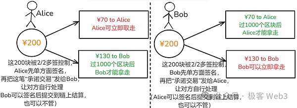 每筆承諾交易都要2/2多簽才能生效,Bob本地構(gòu)造的、對(duì)自己有利的承諾交易不滿足2/2多簽,而滿足2/2多簽的承諾交易扣在Alice手上,Bob沒(méi)法提交,只能由Alice提交,這就形成了制衡。反過(guò)來(lái)也是類似的道理。