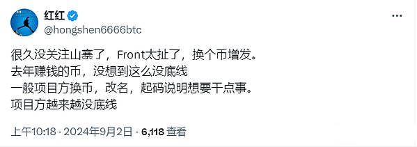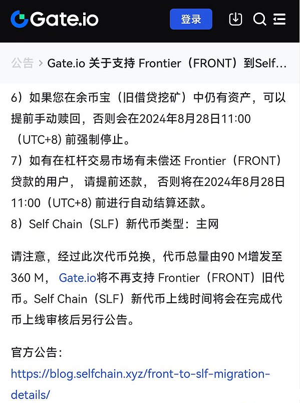 8月30日,幣安宣布完成Frontier(FRONT)Tokens的置換和品牌升級,Frontier更名為Self Chain(SLF),SLF成為新Tokens代碼。根據公告,所有FRONTTokens按照1:1的比例置換為SLFTokens。然而,令社區成員感到憤怒的是,FRONT的Tokens總量在此過程中從9000萬枚增發至3.6億枚,但置換補償卻并未調整,導致投資者手中的Tokens價值被大幅稀釋。