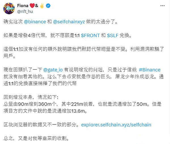 另外,鏈上分析師@defioasis指出,SLFTokens增發4倍,而用戶卻僅按1:1比例兌換,這相當于用戶持有的Tokens價值被稀釋了75%。其他社區成員也紛紛批評項目方和幣安的處理方式,認為這是一種不公平的做法。