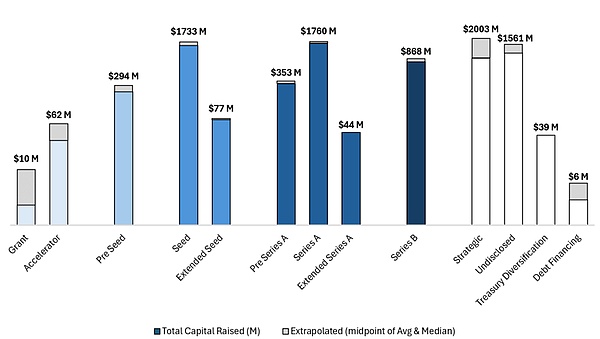 種子輪是最活躍的融資階段,其次是加速器和Pre-Seed輪。隨著Tokens上市,Pre-Seed輪和種子輪之間的差距正在縮小。