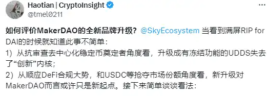 上周,MakerDAO 宣布將其品牌名稱正式更改為 Sky Protocol,并將原有的Tokens和穩(wěn)定幣升級為 SKY 和 Sky Dollar(USDS)。這一舉動迅速引發(fā)了社區(qū)的廣泛討論,尤其是在老用戶中間引起了不少質(zhì)疑和批評。批評者認(rèn)為,新的名字缺乏特色,更像是一家 Web2 公司,與 Web3 的Decentralization精神背道而馳。此外,關(guān)于原X(推特)賬戶的管理不善也進(jìn)一步加劇了社區(qū)的不滿。盡管如此,這一改名行動仍然成為行業(yè)內(nèi)的焦點(diǎn),尤其是在當(dāng)今市場環(huán)境下,許多項(xiàng)目都在采用類似的策略,試圖通過品牌重塑來重新吸引市場的關(guān)注。