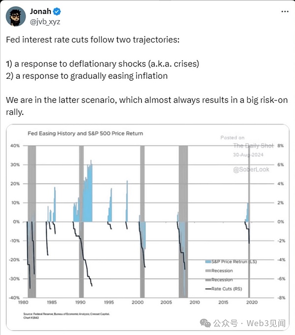 現在,美聯儲通常會出于兩種原因之一降息:應對通貨緊縮沖擊或應對逐步緩解的通脹。從歷史上看,第二種情況幾乎總是會導致大幅風險偏好反彈,即股票或Crypto等風險市場出現反彈。