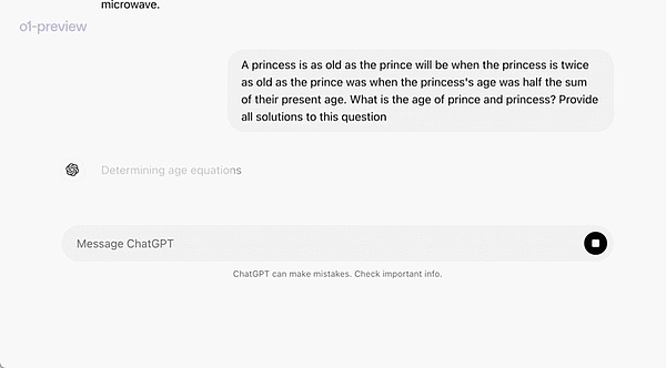 在一個官方演示中,o1-preview解答了一個非常困難的推理問題:當公主的年齡是王子的兩倍時,公主的年齡與王子一樣大,而公主的年齡是他們現(xiàn)在年齡總和的一半。王子和公主的年齡是多少?提供這個問題的所有解。