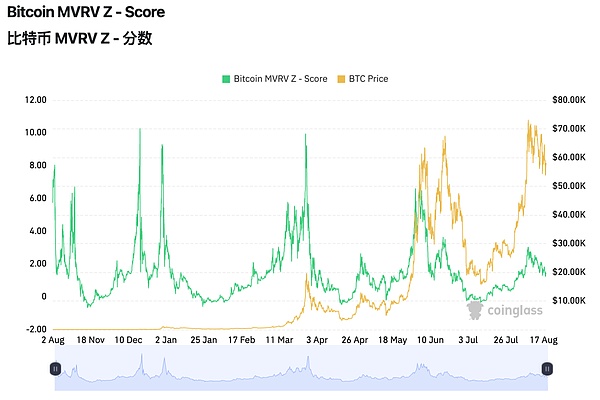 從上圖2010年-2024年數(shù)據(jù)中我們可以看出,相比之前周期,MVRV-Z分?jǐn)?shù)(綠色線)波動(dòng)、峰值和回報(bào)相對溫和,并不像早期那般幅度大。