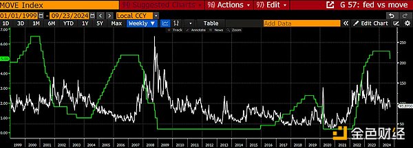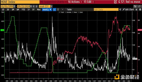 我將要展示的第一張圖表是MOVE指數(shù)(白色),該指數(shù)衡量美國(guó)債券市場(chǎng)的波動(dòng)性與聯(lián)邦基金上限利率(綠色)的關(guān)系。正如你所知,我認(rèn)為數(shù)量比價(jià)格更重要,但在這種情況下,使用價(jià)格來(lái)呈現(xiàn)圖景卻極其清晰。