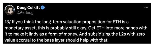 如果有未來L2生態(tài)繁榮的一天,作為具有網(wǎng)絡(luò)效應(yīng)的ETH,即使不一定具有壟斷效應(yīng),仍能獲得增量帶來的采用上的巨額回報(bào),屆時(shí)Ethereum將逐漸奠定以ETH資產(chǎn)為主導(dǎo)的價(jià)值形式。