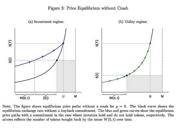 活動(dòng)增長(zhǎng):假設(shè)交易平臺(tái)的活動(dòng)以固定的增長(zhǎng)率\(g 活動(dòng)量:在沒有發(fā)生崩潰的情況下,平臺(tái)在時(shí)間\(t\)的活動(dòng)量為 \(A(t)=e^{gt}\),否則\(A(t)\)接近于0。 此模型考慮了Tokens的效用需求和交易所為回購Tokens而投入的資源量如何與平臺(tái)活動(dòng)成正比,進(jìn)一步設(shè)定了交易所運(yùn)行概率和違約強(qiáng)度,為理解交易所Tokens的市場(chǎng)動(dòng)態(tài)提供了一個(gè)全面的分析框架。五、均衡分析 A.市場(chǎng)清算條件的圖形表示 在分析均衡結(jié)果之前,文章提供了市場(chǎng)清算條件的圖形表示。圖2展示了市場(chǎng)清算條件的機(jī)制,其中給定的X$(t)值由圖中的陰影矩形表示。向上傾斜的曲線代表了用戶向投資者和交易平臺(tái)提供Tokens的供給曲線。投資者和交易平臺(tái)持有的Tokens總量為W(0,t)+Z(t),用戶則持有剩余部分,即MW(0,t)Z(t)。用戶保持的美元余額為X$(t)。如果匯率上升,用戶愿意提供更多的Tokens,因?yàn)樗麄冃枰^少的Tokens來維持相同的美元余額X$(t)。這導(dǎo)致了匯率與投資用途Tokens數(shù)量之間關(guān)系的向上曲線。 B.有無投資者的均衡匯率 均衡匯率水平取決于平臺(tái)的回購承諾是否足夠大,能夠吸引投資者持有Tokens。要讓投資者持有Tokens,所需的回購資源隨著投資者預(yù)期回報(bào)的增加、平臺(tái)的失敗率上升而增加,隨著平臺(tái)增長(zhǎng)率的增加而減少。 圖(a)顯示了當(dāng)投資者選擇持有Tokens時(shí),回購計(jì)劃下的均衡路徑;圖(b)則顯示了當(dāng)投資者不持有Tokens,平臺(tái)僅從用戶手中回購時(shí)的均衡路徑。在g=0(平臺(tái)無增長(zhǎng))的情況下,黑色曲線未發(fā)生變化,匯率的變化完全由回購驅(qū)動(dòng)。 推論1 在完全回購計(jì)劃中,如果Y$>(r+λg)X$,那么初始均衡匯率為 S(0)=1/M*Y$/(r+λg)。否則,初始均衡匯率為S(0)=X$/M。如果投資者持有Tokens,匯率的變化類似于戈登增長(zhǎng)模型下持續(xù)增長(zhǎng)的現(xiàn)金流估值。如果投資者不持有Tokens,初始匯率僅反映用戶需求與Tokens數(shù)量的比例。 六、平臺(tái)的回購計(jì)劃成本 A.資本成本與所需回報(bào)率之間的差距 本文利用模型評(píng)估交易所通過回購承諾籌集的額外資金與回購計(jì)劃預(yù)期成本之間的差異。交易所通過出售帶有回購承諾的Tokens獲得的資金,等于Tokens總量乘以均衡匯率。若沒有回購承諾,交易所出售Tokens的收入為X$,因此回購承諾帶來的增量收入為差額。C表示回購計(jì)劃整個(gè)期間的預(yù)期成本,這可以通過計(jì)算出整個(gè)計(jì)劃的折現(xiàn)成本來得出。 命題2 通過提供回購承諾,交易所能夠籌集的額外資金少于其預(yù)期的折現(xiàn)成本。 該命題表明,通過回購承諾籌集的資金成本高于投資者要求的回報(bào)率。因此,若交易所能夠通過更高效的資本市場(chǎng)以較低成本籌資,則應(yīng)避免回購承諾。 B.價(jià)格操縱下的額外成本 通過回購承諾發(fā)行Tokens可能導(dǎo)致更高的成本,尤其是可能被大投資者通過“銷毀”Tokens(即永久凍結(jié)Tokens)來操縱價(jià)格。此時(shí),平臺(tái)可能被迫無限期回購,推高Tokens價(jià)格。 1. 單一大投資者 命題3 如果一個(gè)大投資者持有用戶未持有的所有Tokens,則投資者可以銷毀部分Tokens,前提是某些條件成立。這使得Tokens價(jià)格上漲,回購速度放緩,最終導(dǎo)致平臺(tái)無法完成回購計(jì)劃,價(jià)格持續(xù)上漲。 2. 一個(gè)大投資者,多個(gè)小投資者 命題4 若最大投資者持有的Tokens比例達(dá)到一定水平,則銷毀部分Tokens對(duì)其有利。在這種情況下,即使有其他小投資者加入銷毀行動(dòng),最大的投資者仍能從中獲利。 3. 許多小投資者 當(dāng)沒有單個(gè)投資者持有足夠的Tokens來進(jìn)行操縱時(shí),多個(gè)投資者可以通過合作銷毀Tokens獲利。這種合作通過Blockchain上的多重輸入交易可以實(shí)現(xiàn),盡管在實(shí)際操作中協(xié)調(diào)多個(gè)投資者可能較為復(fù)雜。 4. 防止操縱 平臺(tái)可以通過限制回購承諾的Tokens數(shù)量來防止操縱。如果平臺(tái)承諾回購的Tokens數(shù)量超過Tokens總量的一半,則容易受到操縱。因此,許多平臺(tái)通常會(huì)限制回購承諾的比例在50%以內(nèi)。七、具有投資動(dòng)機(jī)的用戶 在本節(jié)中,討論了用戶對(duì)Tokens的需求受其價(jià)格升值率影響的情形,尤其是在回購計(jì)劃是全額回購時(shí)的情況。即便平臺(tái)只承諾少量資源用于回購,只要用戶有投資動(dòng)機(jī),回購承諾仍然會(huì)對(duì)Tokens價(jià)格產(chǎn)生影響,從而影響平臺(tái)通過Tokens銷售籌集的資金量。 命題5 當(dāng)用戶的需求取決于Tokens升值率時(shí),回購承諾的資源越多,用戶需求和平臺(tái)通過Tokens銷售籌集的資金也會(huì)越多。 例如,如果用戶的效用函數(shù)是對(duì)數(shù)函數(shù),回購承諾的資源越多,初始均衡匯率就會(huì)越高。 八、結(jié)論 本文得出,回購承諾對(duì)加密交易所Tokens的價(jià)格動(dòng)態(tài)有顯著影響,并且在某些情況下可能導(dǎo)致劇烈的價(jià)格波動(dòng)。回購承諾是一種成本高昂的籌資方式,可能會(huì)被大投資者或多個(gè)小投資者利用。因此,回購承諾的存在通常表明平臺(tái)在傳統(tǒng)資本市場(chǎng)中面臨融資障礙