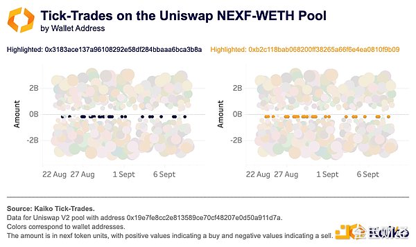 為了進一步確認涉及此Tokens的洗盤交易,檢查該Tokens唯一存在的二級市場的市場數(shù)據(jù)。通過匯總此Uniswap市場上的每日交易量并比較買入和賣出量,發(fā)現(xiàn)兩者之間存在驚人的對稱性。這種對稱性表明,做市商每天都在抵消這個市場上從事洗盤交易的所有錢包的總金額。