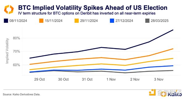 美國(guó)大選前的Bitcoin隱含波動(dòng)率。圖片來(lái)源:Kaiko。