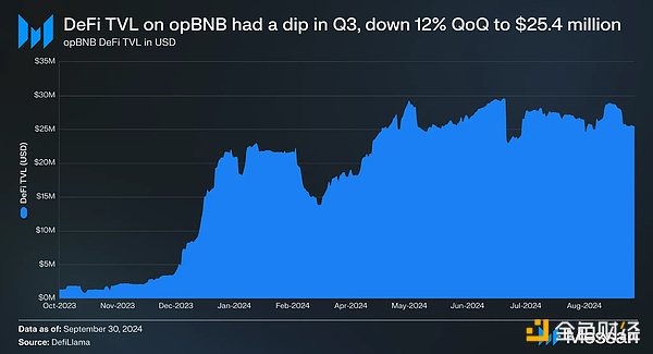 PancakeSwap在第三季度的TVL略有下降,從17.2億美元降至16.4億美元,環比下降5%。PancakeSwap由三個不同的AMM組成(PancakeSwapAMM、StableSwap和AMMV3)。到第三季度末,AMM的TVL為11.9億美元(占TVL的73%),StableSwap的TVL為1,470萬美元(不到TVL的1%),AMMV3的TVL為3.791億美元(占TVL的23%)。然而,PancakeSwap的TVL占比下降到34%(環比從36%下降7%)?偟膩碚f,VenusFinance和PancakeSwap占BNBSmartChainTVL的71%。