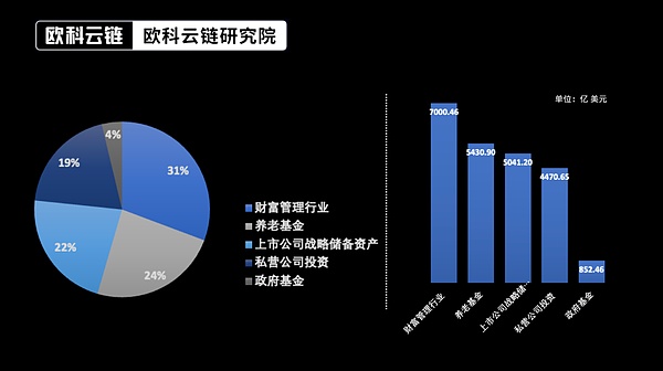 c.私營公司按照現在已披露的對公開上市公司的比重90%進行同步計算。d.財富管理行業(yè)根據摩根斯坦利、Capgemini、埃森哲等調查報告,高凈值人群中已有71%進行了對Bitcoin的投資,選取剩余待投資的高凈值人群財富規(guī)模乘以成長系數4.5%再乘以投資比例5%進行測算。