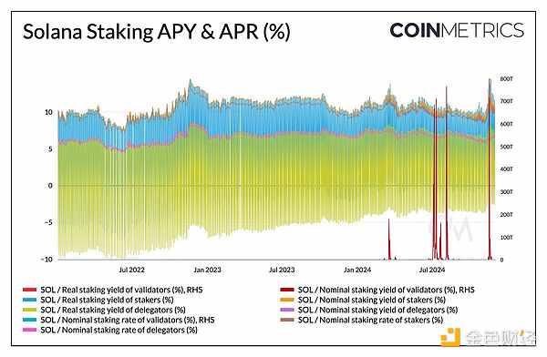 Ethereum的名義質(zhì)押收益率為3.08%(經(jīng)通脹調(diào)整后為2.73%),是鏈上經(jīng)濟的基準。Solana提供更高的收益率,為11.5%(實際收益率為12.5%),但由于獎勵結構不同,委托人的收益低于驗證者。