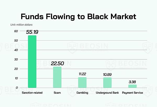 與黑灰產業直接關聯的資金中,約53.49%流向了受制裁平臺,相關交易次數甚至是流向地下錢莊的兩倍,總價值超過5500萬美元,說明受制裁平臺仍然是高風險資金的主要流入地。