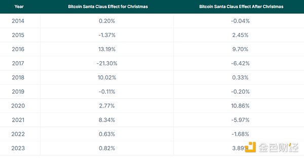另一方面,加密市場在圣誕節前一周出現「圣誕老人行情」的次數較少,在過去10年中僅發生了5次。與圣誕節后的行情類似,這些圣誕節前的上漲幅度在0.15%至11.56%之間。