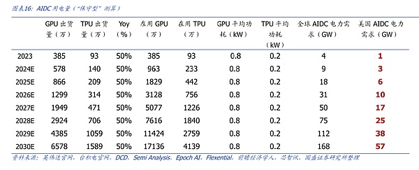 測算邏輯:測算角度二是從數據中心建設角度出發(fā),參考第三方預測的全球數據中心建設進度(復合增速25%),同時由于預測數據截至2026年,我們假設2027至2030年依舊維持25%的復合增速,對全球數據中心電力需求進行預測,并假設其中AIDC的用電量和占比,因此我們認為,該預測角度得到的數據較為“樂觀”,最終預測到2030年美國AIDC用電需求最高為91GW。